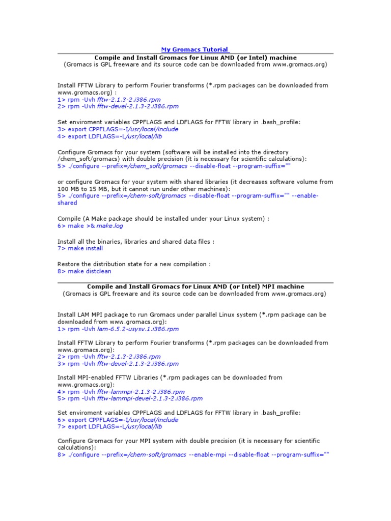 and its source code can be downloaded from www.gromacs.org) Install FFTW Library to perform Fourier transforms (*.rpm packages can be downloaded from www.gromacs.org) : 1> rpm -Uvh fftw-2.1.3-2.i386.rpm 2> rpm -Uvh fftw-devel-2.1.3-2.i386.rpm Set enviroment variables CPPFLAGS and LDFLAGS for FFTW library in .bash_profile: 3> export CPPFLAGS=-I/usr/local/include 4> export LDFLAGS=-L/usr/local/lib Configure Gromacs for your system (software will be installed into the directory /chem_soft/gromacs) with double precision (it is necessary for scientific calculations): 5> ./configure --prefix=/chem_soft/gromacs --disable-float --program-suffix="" or configure Gromacs for your system with shared libraries (it decreases software volume from 100 MB to 15 MB, but it cannot run under other machines): 5> ./configure --prefix=/chem-soft/gromacs --disable-float --program-suffix="" --enableshared Compile (A Make package should be installed under your Linux system) : 6> make >& make.log Install all the binaries, libraries and shared data files : 7> make install Restore the distribution state for a new compilation : 8> make distclean Compile and Install Gromacs for Linux AMD (or Intel) MPI machine (Gromacs is GPL freeware and its source code can be downloaded from www.gromacs.org) Install LAM MPI package to run Gromacs under parallel Linux system (*.rpm package can be downloaded from www.gromacs.org): 1> rpm -Uvh lam-6.5.2-usysv.1.i386.rpm Install FFTW Library to perform Fourier transforms (*.rpm packages can be downloaded from www.gromacs.org): 2> rpm -Uvh fftw-2.1.3-2.i386.rpm 3> rpm -Uvh fftw-devel-2.1.3-2.i386.rpm Install MPI-enabled FFTW Libraries (*.rpm packages can be downloaded from www.gromacs.org): 4> rpm -Uvh fftw-lammpi-2.1.3-2.i386.rpm 5> rpm -Uvh fftw-lammpi-devel-2.1.3-2.i386.rpm Set enviroment variables CPPFLAGS and LDFLAGS for FFTW library in .bash_profile: 6> export CPPFLAGS=-I/usr/local/include 7> export LDFLAGS=-L/usr/local/lib Configure Gromacs for your MPI system with double precision (it is necessary for scientific calculations): 8> ./configure --prefix=/chem-soft/gromacs --enable-mpi --disable-float --program-suffix=""
