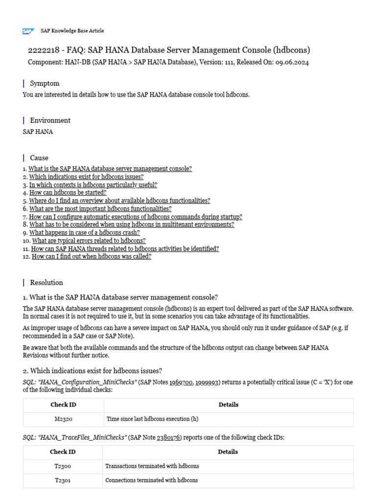 sample P Note 1969700) as described in "How can SAP HANA threads related to hdbcons activities be identified?" in order to check