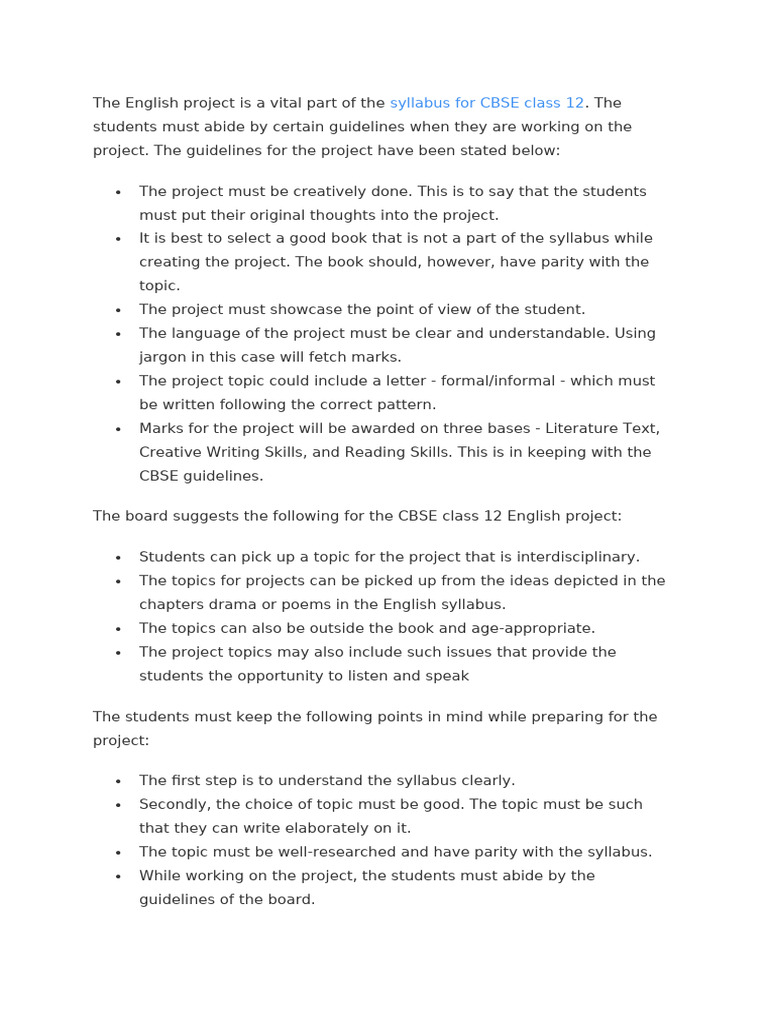 The English project is a vital part of the syllabus for CBSE class 12.