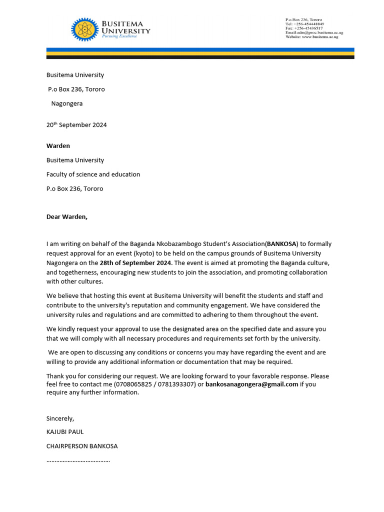 request approval for an event (kyoto) to be held on the campus grounds of Busitema University