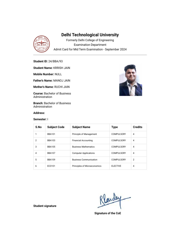 Admit Card for Mid Term Examination - September 2024