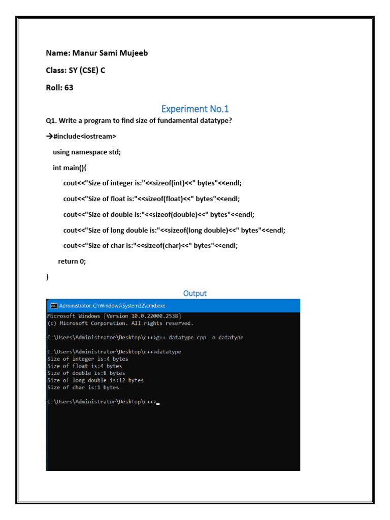 cout<<"Size of char is:"<<sizeof(char)<<" bytes"<<endl;