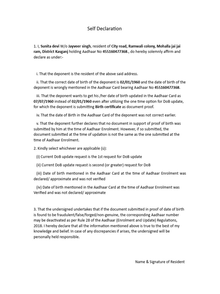 iii. That the deponent wants to get his /her date of birth updated in the Aadhaar Card as