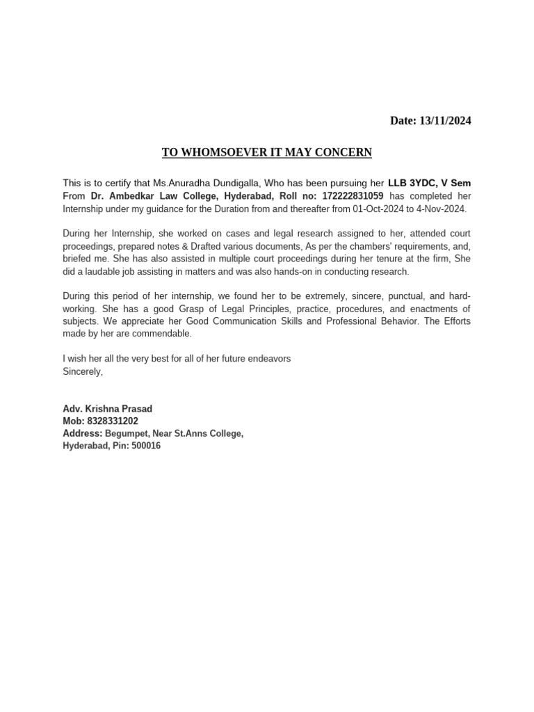This is to certify that Ms.Anuradha Dundigalla, Who has been pursuing her LLB 3YDC, V Sem