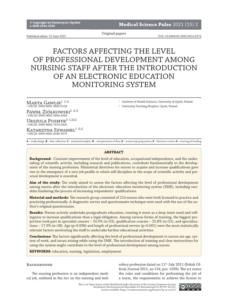 Material and methods: The research group consisted of 214 nurses who were both licensed to practice and