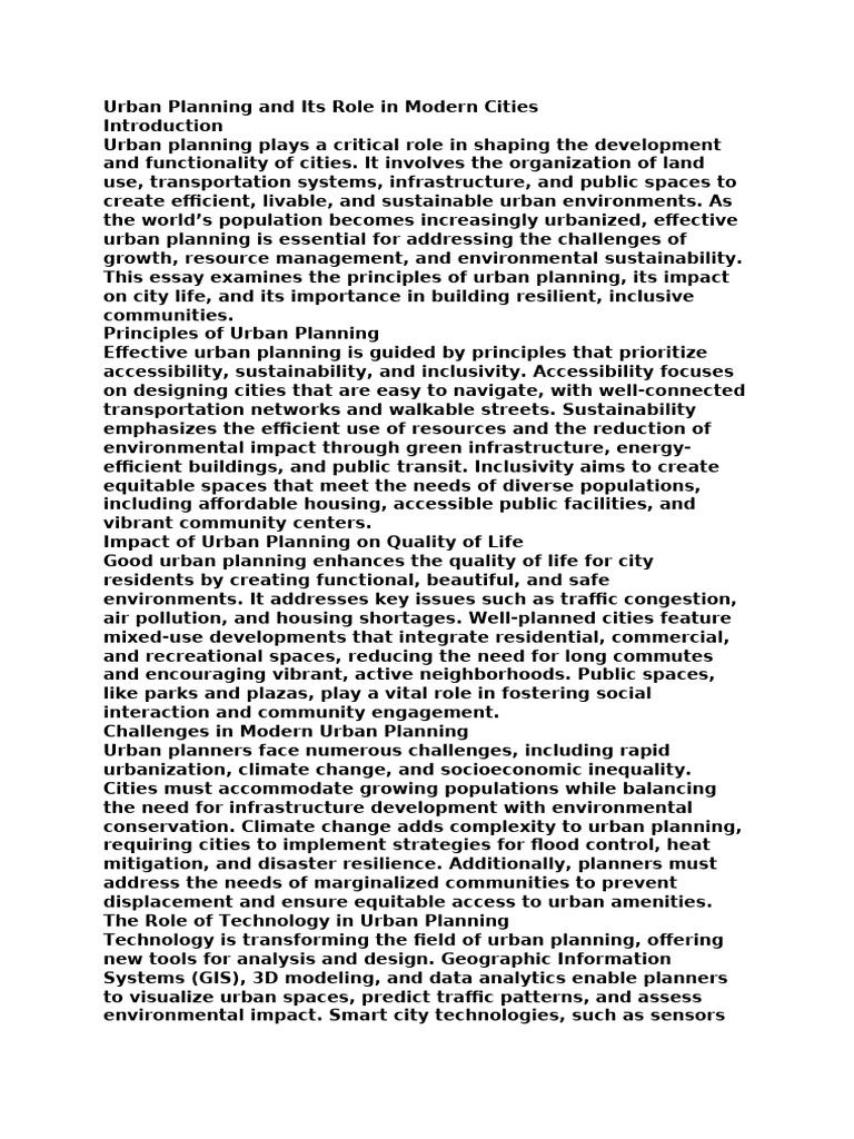 This essay examines the principles of urban planning, its impact