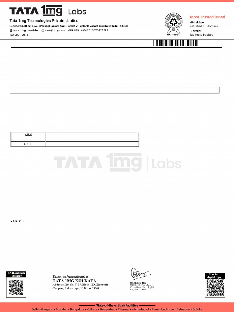 Partial reproduction of the test results is not permitted. Also, TATA 1mg Labs is not responsible for any misinterpretation or misuse of the