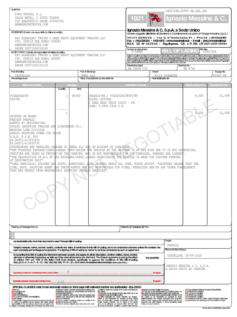 "USED VEHICLE(S) STAINED AND DIRTY, SCRATCHED, WITH SEVERAL DENTS ALL OVER, RUSTS SPOTS". "SHIPPERS DELARE THAT THE