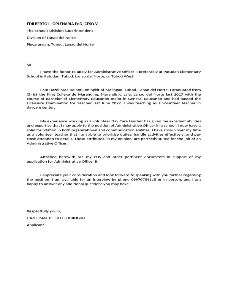 I have the honor to apply for Administrative Officer II preferably at Patudan Elementary