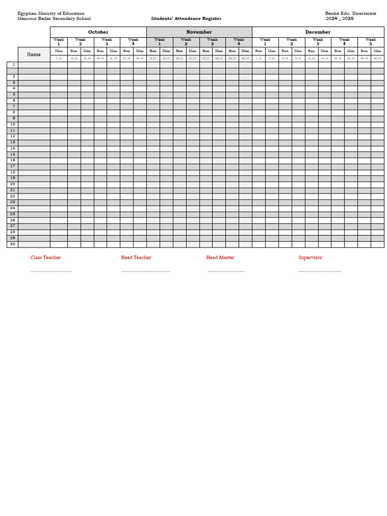Mansour Badar Secondary School Students’ Attendence Register 2024 _ 2025