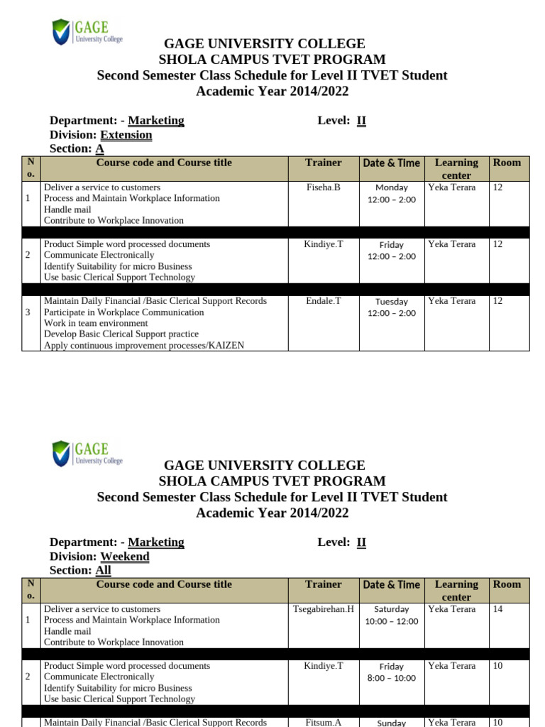 Second Semester Class Schedule for Level II TVET Student