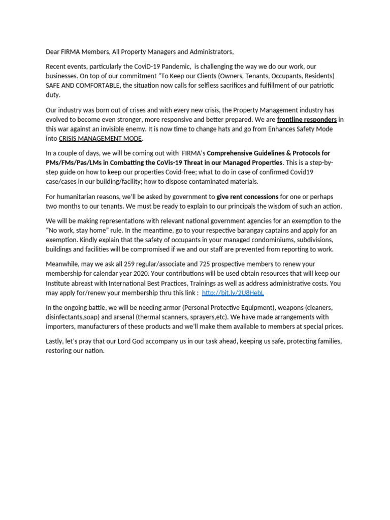 PMs/FMs/Pas/LMs in Combatting the CoVis-19 Threat in our Managed Properties. This is a step-by-