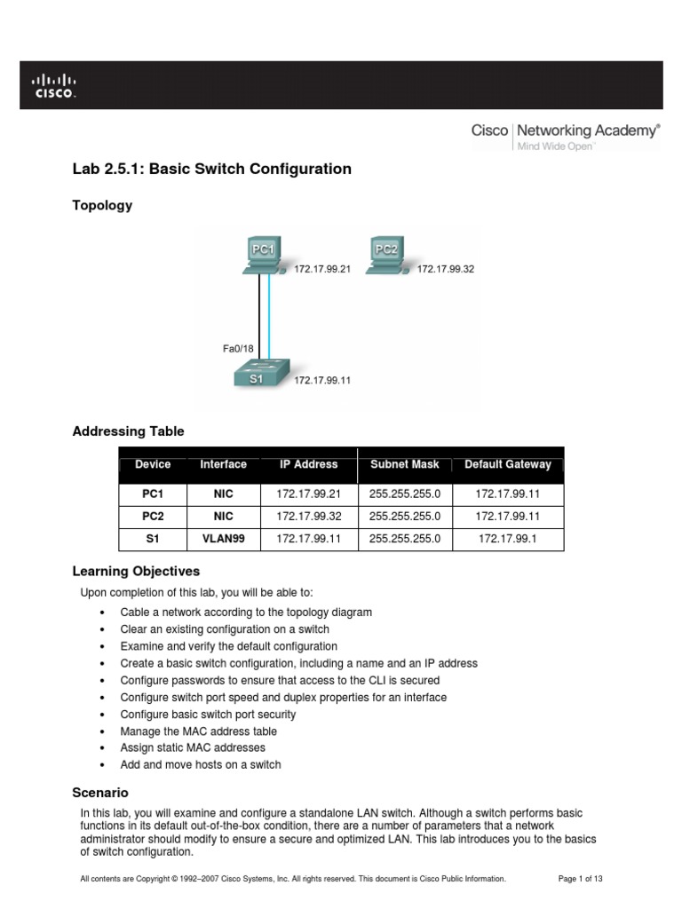 Upon completion of this lab, you will be able to: Cable a network according to the topology diagram Clear an existing configuration on a switch Examine and verify the default configuration Create a basic switch configuration, including a name and an IP address Configure passwords to ensure that access to the CLI is secured Configure switch port speed and duplex properties for an interface Configure basic switch port security Manage the MAC address table Assign static MAC addresses Add and move hosts on a switch