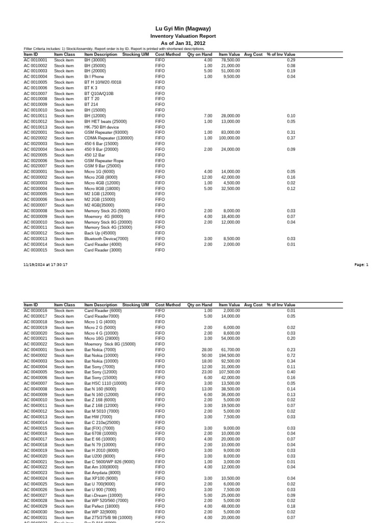 Item ID Item Class Item Description Stocking U/M Cost Method Qty on Hand Item Value Avg Cost % of Inv Value