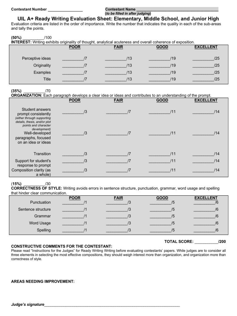 UIL A+ Ready Writing Evaluation Sheet: Elementary, Middle School, and Junior High