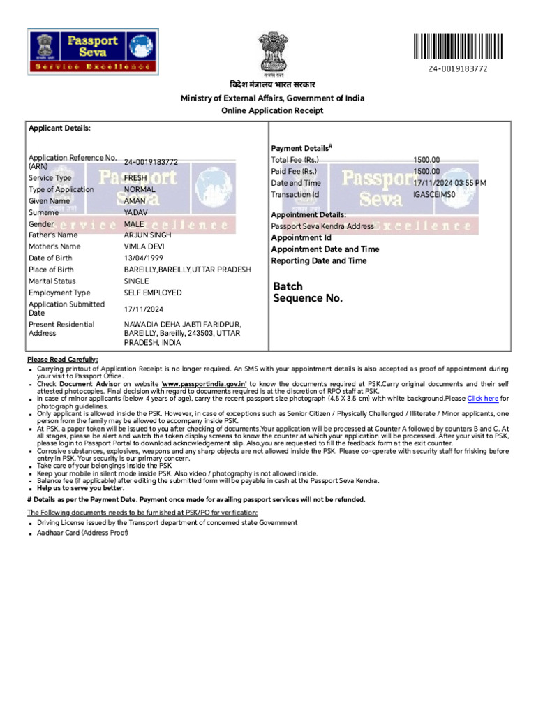 NOTE 1: If an applicant of the age of 18 years and above applies for a passport and desires to obtain a passport on out of turn basis submit Aadhaar