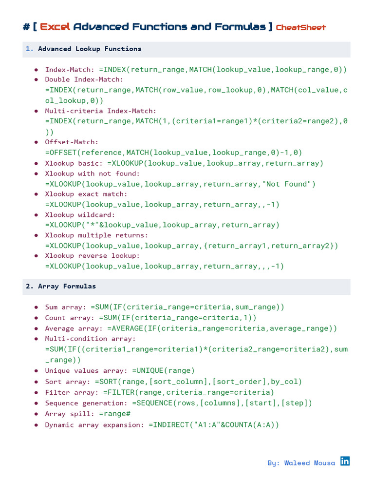 # [ Excel Advanced Functions and Formulas ] CheatSheet