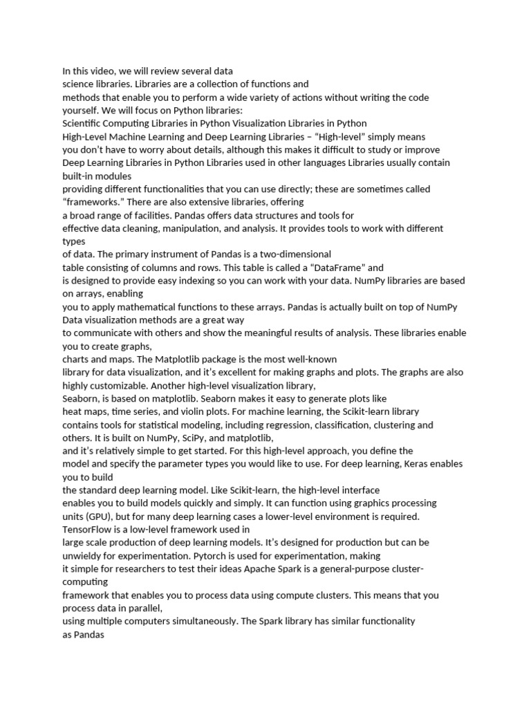 heat maps, time series, and violin plots. For machine learning, the Scikit-learn library