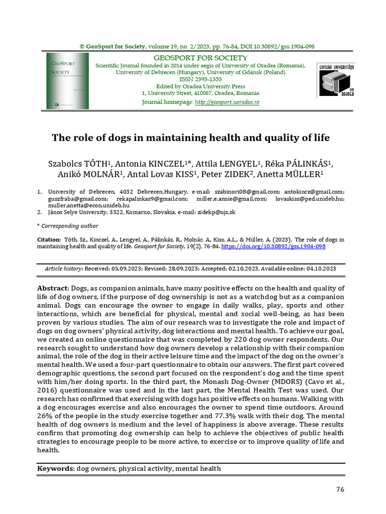 Citation: Tóth, Sz., Kinczel, A., Lengyel, A., Pálinkás, R., Molnár, A., Kiss, A.L., & Müller, A. (2023). The role of dogs in