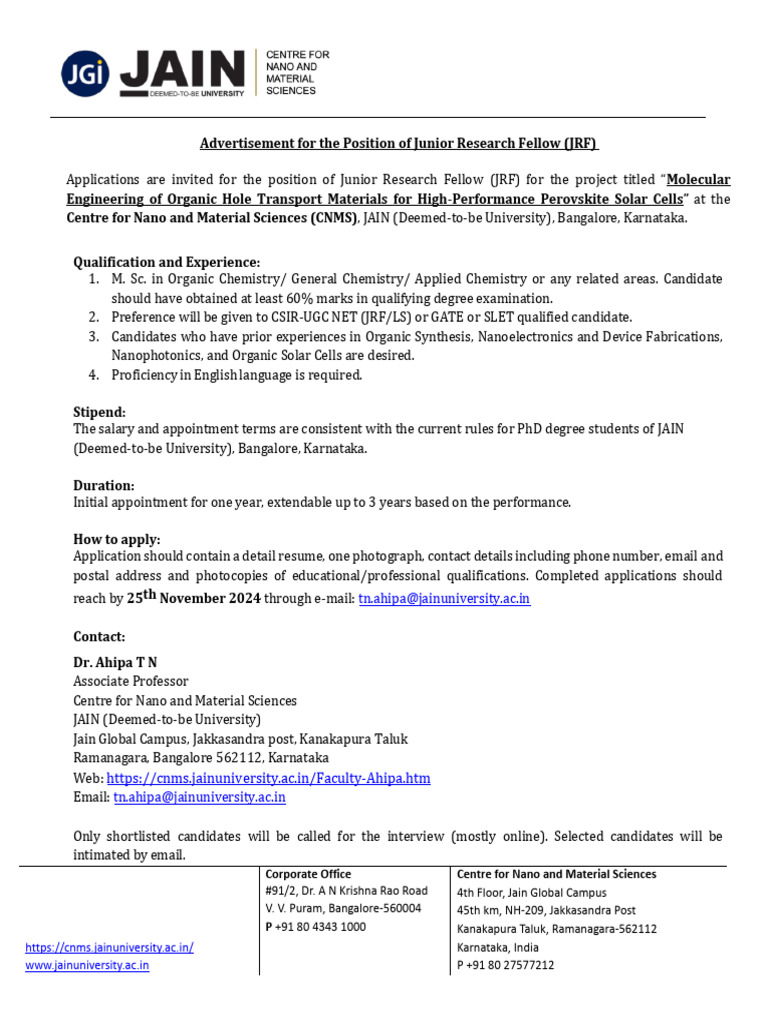 Centre for Nano and Material Sciences (CNMS), JAIN (Deemed-to-be University), Bangalore, Karnataka.