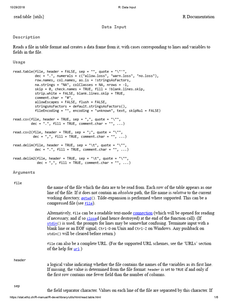 [Link](file, header = TRUE, sep = ",", quote = "\"",
