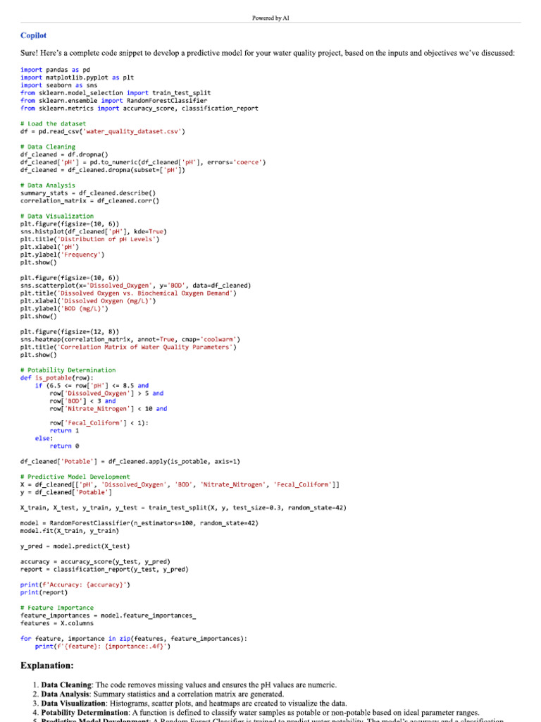 ‘This code provides a comprehensive approach to developing a predictive model for your water quality project. Ifyou have any questions or need further