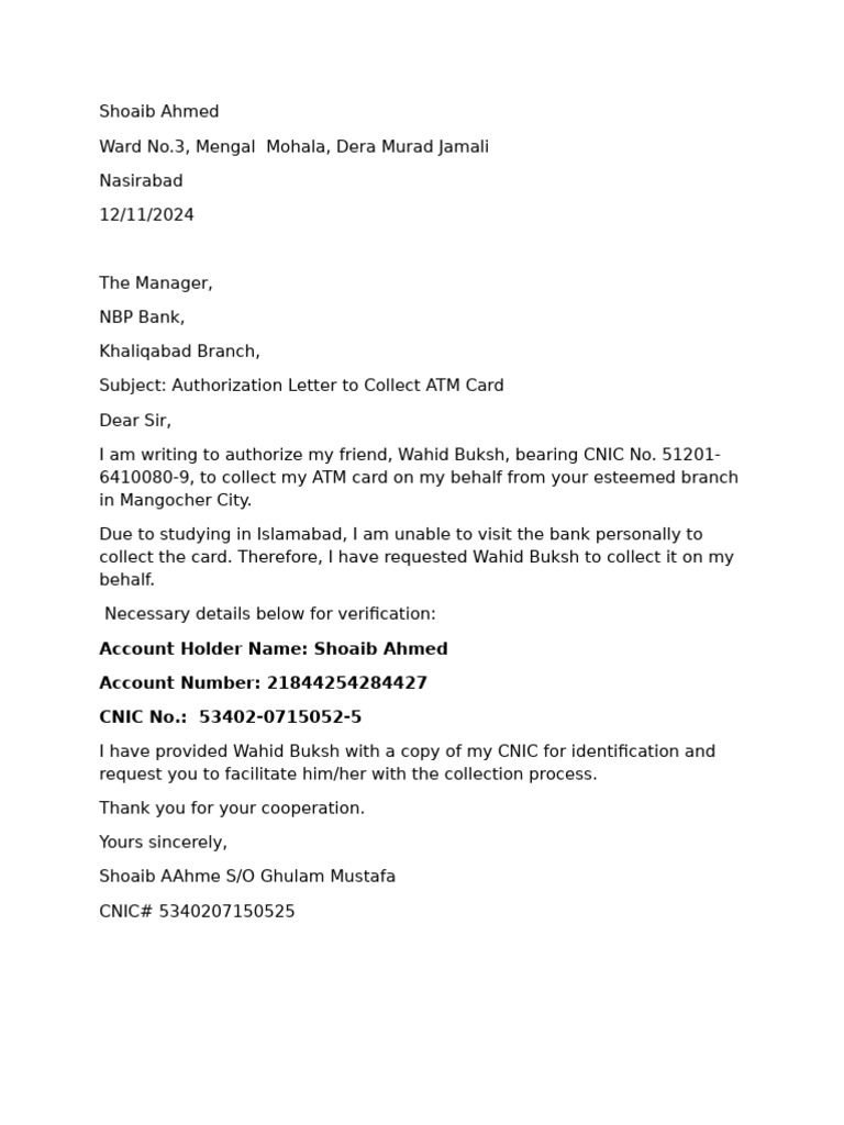 Subject: Authorization Letter to Collect ATM Card