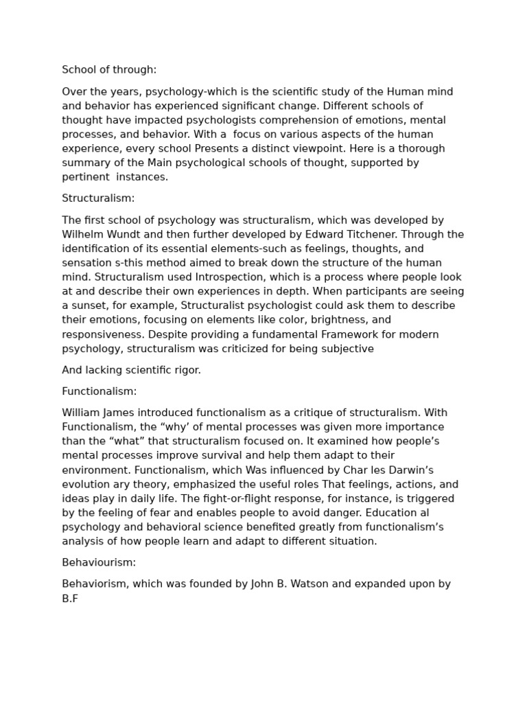 summary of the Main psychological schools of thought, supported by