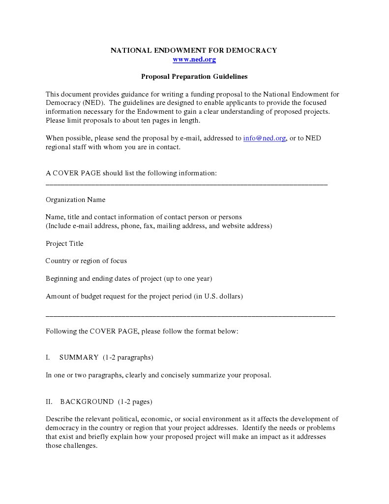 org Proposal Preparation Guidelines This document provides guidance for writing a funding proposal to the National Endowment for Democracy (NED). The guidelines are designed to enable applicants to provide the focused information necessary for the Endowment to gain a clear understanding of proposed projects. Please limit proposals to about ten pages in length. When possible, please send the proposal by e-mail, addressed to info@[Link], or to NED regional staff with whom you are in contact.