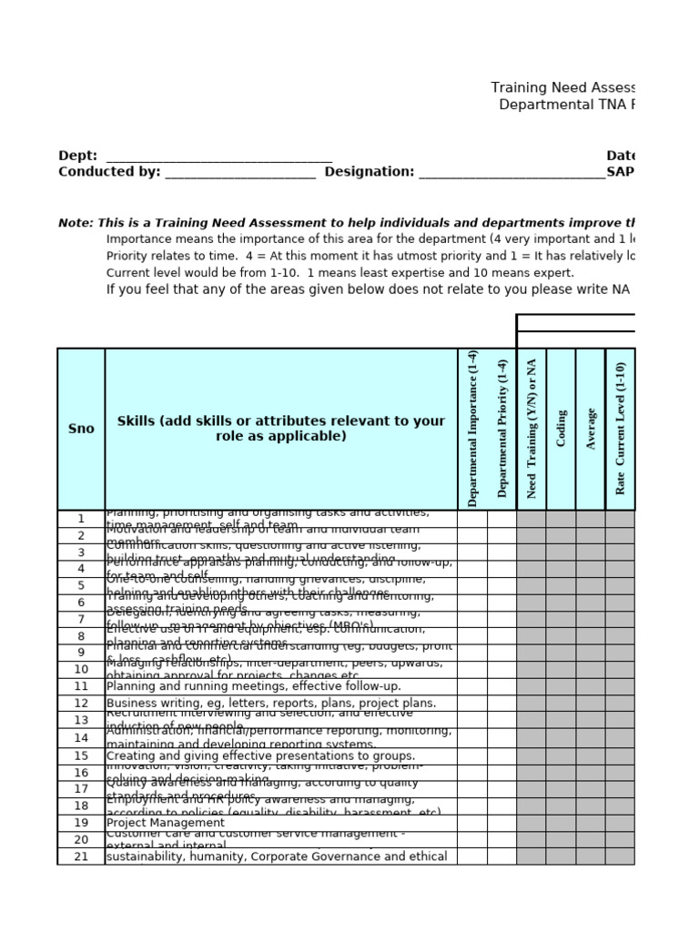 Note: This is a Training Need Assessment to help individuals and departments improve their Performance and Develop Future Human R