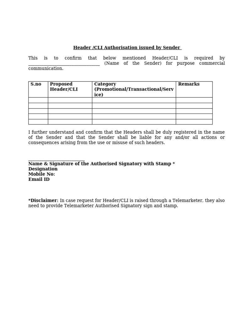 *Disclaimer: In case request for Header/CLI is raised through a Telemarketer, they also