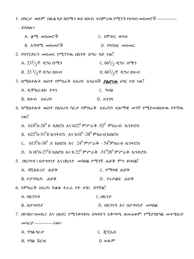 4. ከሚከተለት ዉስጥ በአፍሪካ ካርታ የምስራቅ አፍሪካን ፍፁማዊ መገኛ የሚያመሇክተዉ የትኛዉ