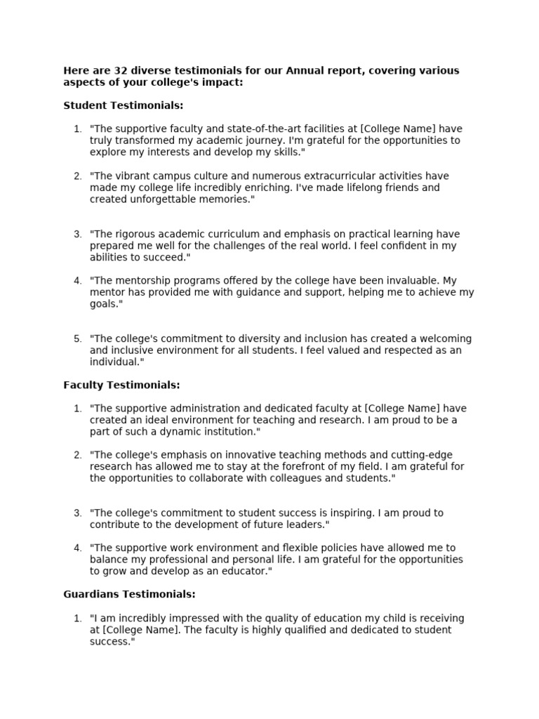 Here are 32 diverse testimonials for our Annual report, covering various