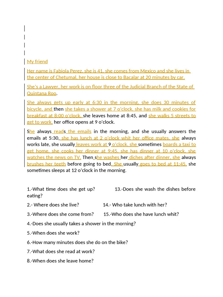 1.-What time does she get up? 13.-Does she wash the dishes before