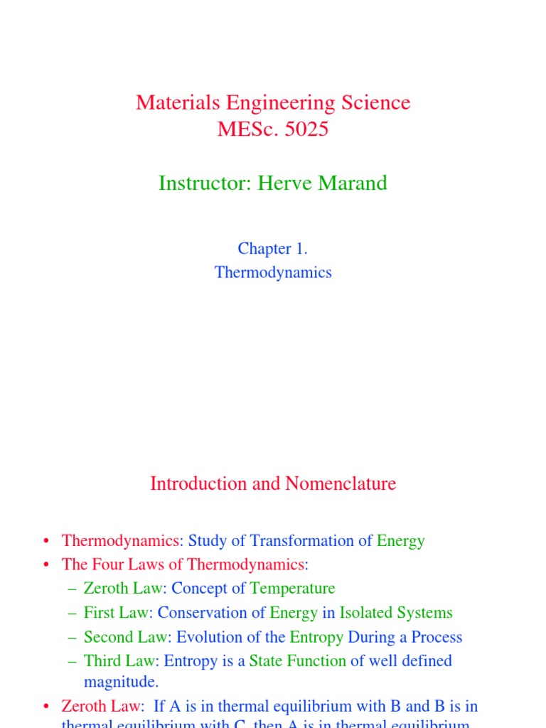 Thermodynamics: Study of Transformation of Energy The Four Laws of Thermodynamics: Zeroth Law: Concept of Temperature First Law: Conservation of Energy in Isolated Systems Second Law: Evolution of the Entropy During a Process Third Law: Entropy is a State Function of well defined magnitude. Zeroth Law: If A is in thermal equilibrium with B and B is in thermal equilibrium with C, then A is in thermal equilibrium with C (TA = TB =TC). Thermometer and the Absolute Temperature (Kelvin) Scale (ideal gas law).