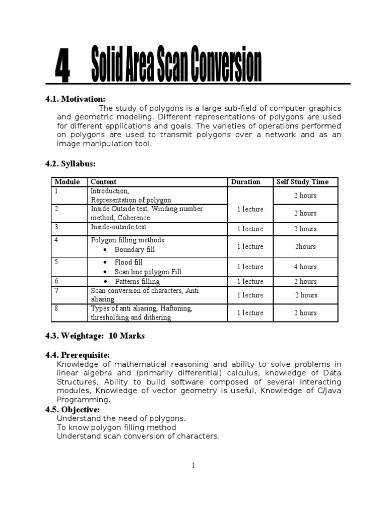 Module 1. 2. 3. 4. 5. 6. 7 8 Content Introduction, Representation of polygon Inside Outside test, Winding number method, Coherence Inside-outside test Polygon filling methods Boundary fill Flood fill Scan line polygon Fill Patterns filling Scan conversion of characters, Anti aliasing Types of anti aliasing, Haftoning, thresholding and dithering Duration 1 lecture 1 lecture 1 lecture 1 lecture 1 lecture 1 lecture 1 lecture Self Study Time 2 hours 2 hours 2 hours 2hours 4 hours 2 hours 2 hours 2 hours