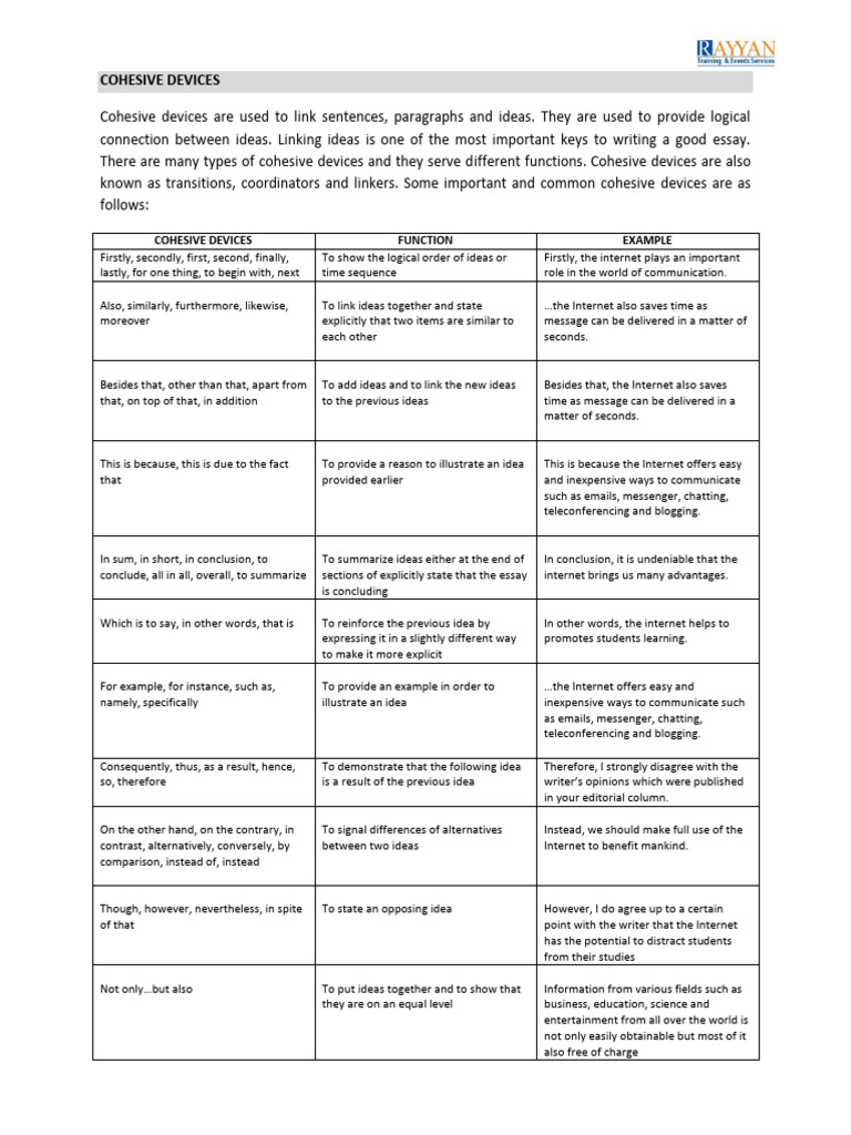 Cohesive devices are used to link sentences, paragraphs and ideas. They are used to provide logical