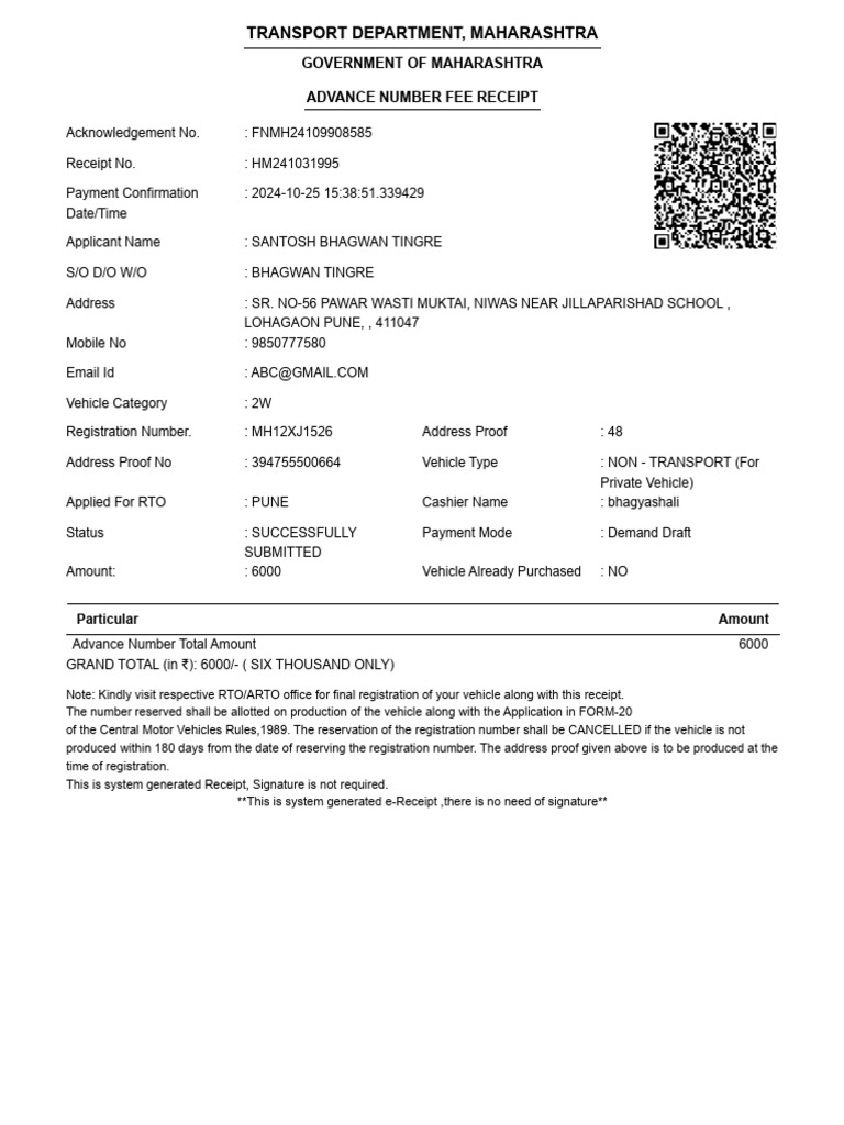 Note: Kindly visit respective RTO/ARTO office for final registration of your vehicle along with this receipt.