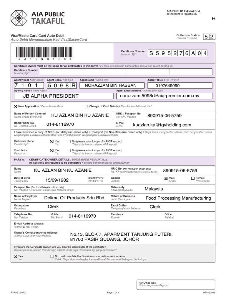 Agency Code / Kod Agensi Agent Code / Kod Ejen Agent Name / Nama Ejen Agent Tel No. / No. Tel Ejen