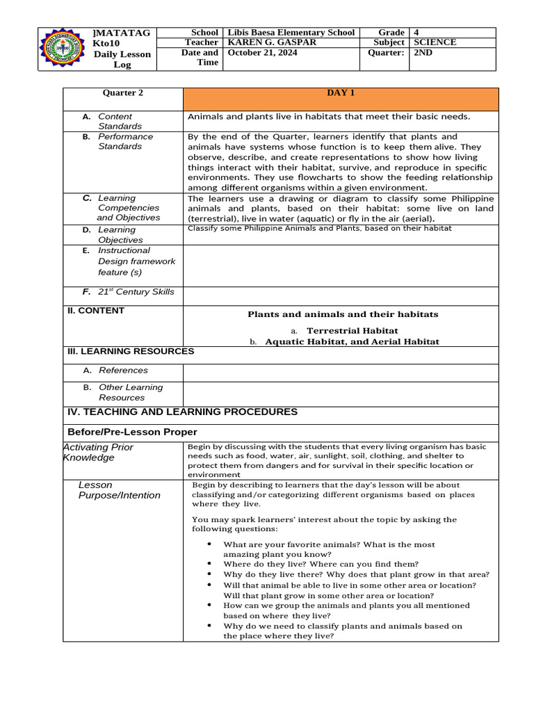 Daily Lesson Log Teacher KAREN G. GASPAR Subject SCIENCE