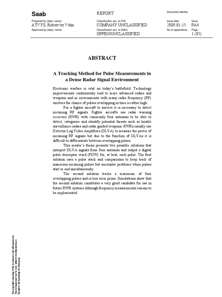 Since the beginning of the 20th century Electronic Warfare has grown to become an important component of warfare [1]. For a fighter aircraft this poses a serious threat. Radars are used to detect the aircraft and smart radar guided weapons have been developed and are continuously improved. To be able to avoid these hazards countermeasures are developed in parallel to the development of new and improved weapons and radars (as well as counter-countermeasures). For a fighter aircraft to survive on todays battlefield it is necessary to detect these radio frequency (RF) signals and take the appropriate actions. A fighter aircraft typically has at least four antennas [2] to retrieve surrounding RF signals and process these. The reason to use at least four is to maximize detection probability. By having an antenna in each direction, detection probability increases as the antennas together have a 360 field of view. The signal from each RF receiver is fed through a component called a Detector Log Video Amplifier (DLVA). A DLVA receives RF pulses from a large dynamic range, amplifies them logarithmically and outputs a video signal which changes linearly over the input range [3, 4, 5]. The typical range of the input signal is in the order of 40 dB and very often the detector in the DLVA is paralleled by another with a RF preamplifier to extend the overall dynamic range to greater than 70 dB [5, 6], e.g. -65dBm (0.32 nW) to +5 dBm (3.2 mW) [7]. 1 dBm is the power ratio in dB with 1 milliwatt as reference power. The video signal from each DLVA is processed by the radar warning receiver (RWR) system, which performs pulse measurements and geometric triangulation to determine the main pulse parameters: pulse width (PW), pulse amplitude (PA; the power of the signal), angle of arrival (AOA) or bearing, time of arrival (TOA) and frequency () [8, 9]. These parameters form a digital description of the pulse (or signal) in what is commonly called a pulse descriptor word (PDW). Typical frequencies of radar signals are 0.440 GHz [10]. Lower frequencies are often used for surveillance radars while higher frequencies are used for target acquisition radars [1]. A commonly used type of antenna is the planar spiral antenna which, despite a small size and weight, can retrieve RF signals from a large range, typically 218 GHz [11]. This is often referred to as a wide band (WB) antenna because its wide frequency range. There are multiple algorithms and techniques focused on sorting and analyzing PDWs coming from multiple emitters, a process called radar pulse deinterleaving. Radar pulse deinterleaving is the process of categorizing different PDWs and group them together so that, ideally, all pulses generated by an emitter is grouped together in a single group. Groups of PDWs can then be analyzed as a fingerprint of what type of emitter the RF signals where sent from, e.g. surveillance radar, radar guided missile or a fishing boat with surface search radar [11].