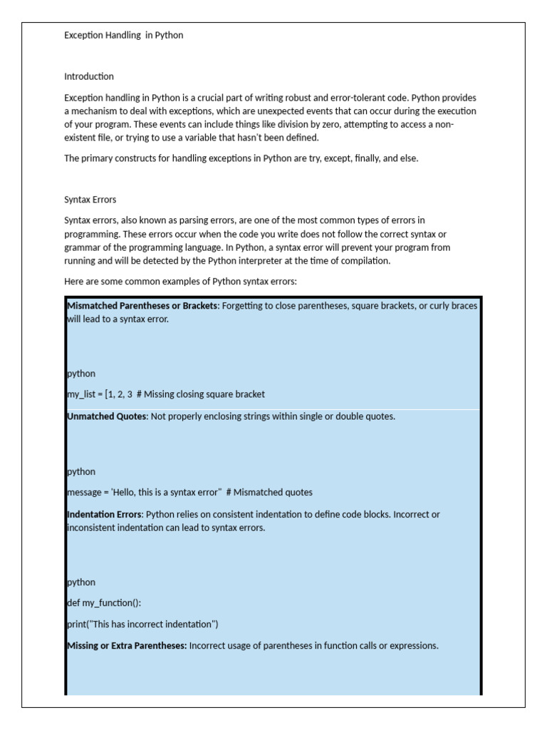 Exception handling in Python is a crucial part of writing robust and error-tolerant code. Python provides
