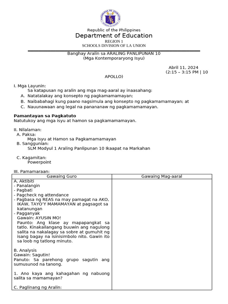 Banghay Aralin sa ARALING PANLIPUNAN 10
