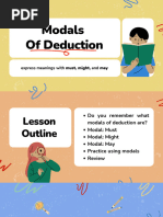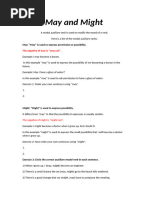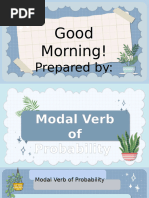 Listed below are examples and uses of modal verbs of probability. Modal verbs of probability are used to express an opinion of the speaker based on information that the speaker has. Example: He must be at work; it's 10 o'clock. In this case, the speaker is 100 % sure that the person is at work based on the speaker's knowledge that the person in question usually works at during the day. Examples They must be in Spain by now. She must have done well on the test. She might come this evening. David may invite Use 'might' or 'may' to express an Jesica to the opinion that you think has a good match. possibility of being true. Jack might have gone to France. Jane could be at Use 'could' to express a possibility which work. is one of many. This form is not as strong as 'might' or 'may'. It is just one of a Peter could have number of possibilities. arrived late. You can't be serious! Use 'can't' to express an opinion that you are 100% sure is NOT true. Usage Use 'must' plus the verb when you are 100% (or almost 100%) sure that something is the case.