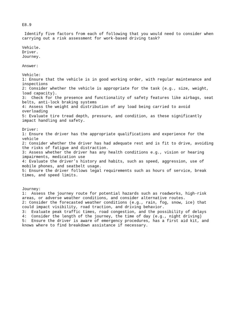 carrying out a risk assessment for work-based driving task?