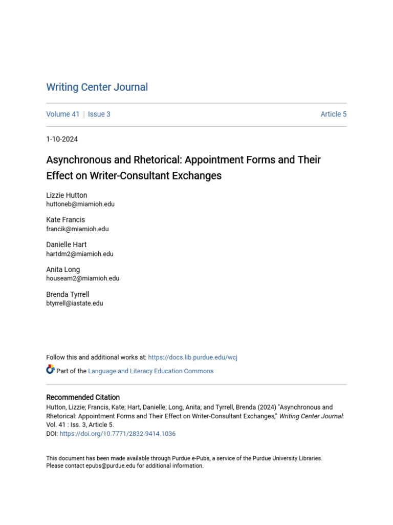 Rhetorical: Appointment Forms and Their Effect on Writer-Consultant Exchanges," Writing Center Journal: