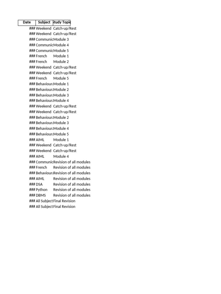 Date Subject Study Topic