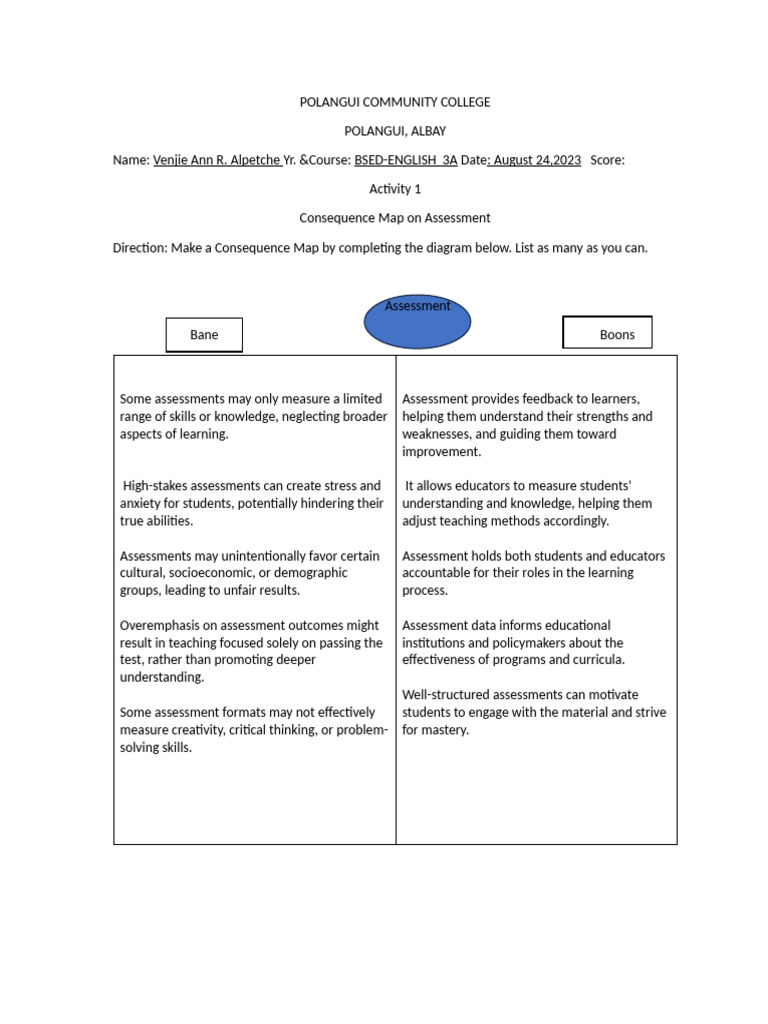 Name: Venjie Ann R. Alpetche Yr. &Course: BSED-ENGLISH 3A Date: August 24,2023 Score: