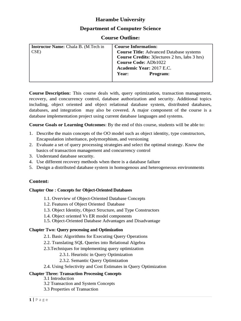 Instructor Name: Chala B. (M.Tech in Course Information: