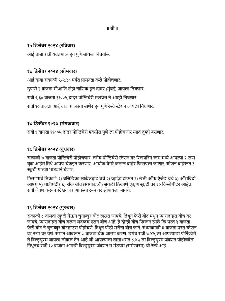 ननघायचे . रात्री ८.४५ ला माझी चेन्नई ची रे ल्वे आहे . बाकी तुम्ही चौघाुं ची रात्री ९.३० वाजता कन्याकुमारी ची